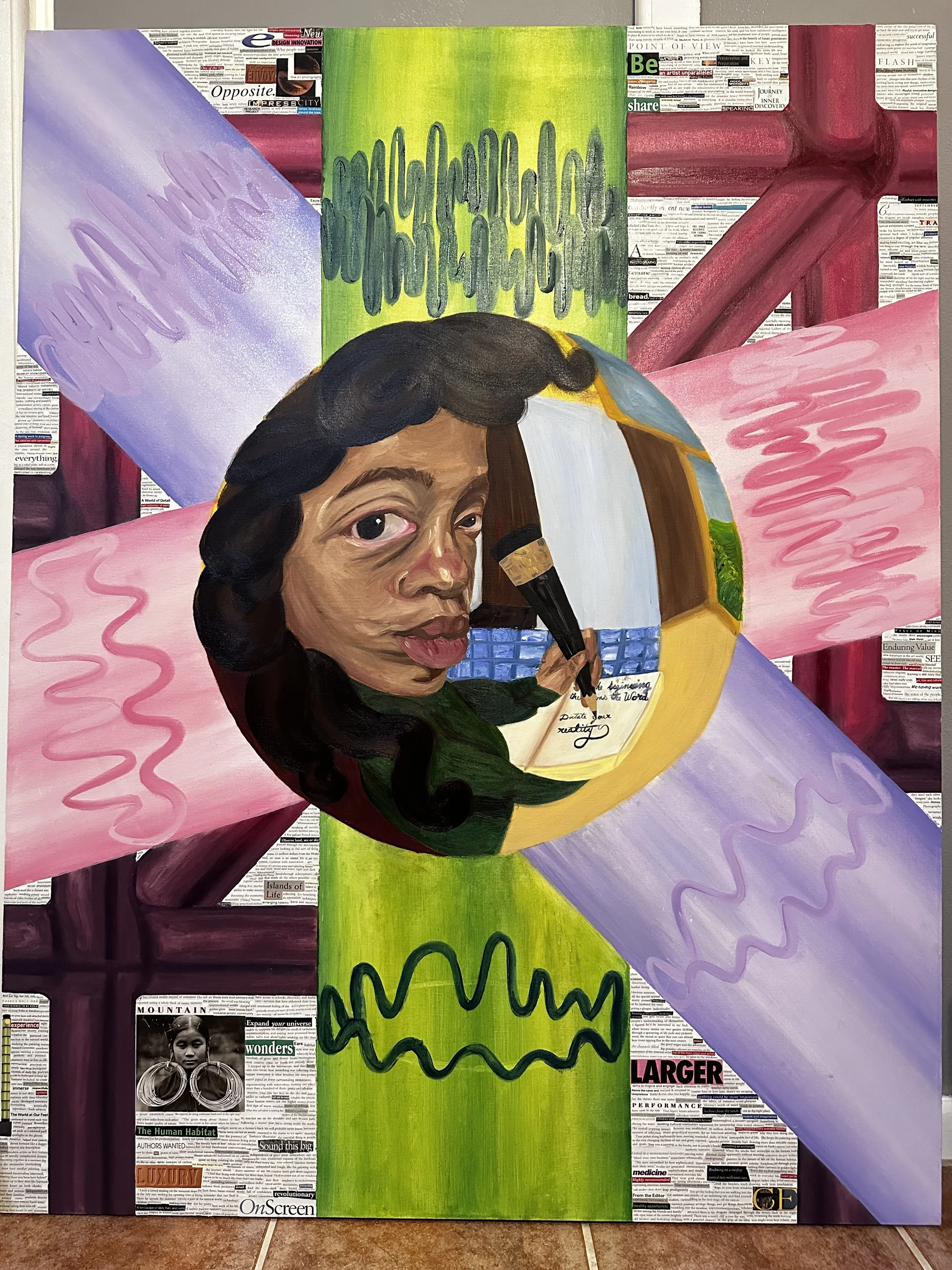 Catherine Esprit is an Afro Latina multidisciplinary artist who communicates her thoughts and emotions through paint, fabric, collage, and more. Her work explores realism, abstraction, philosophy, and spirit. She notices patterns in life that evoke emotion and inserts them into her pieces, across all mediums.